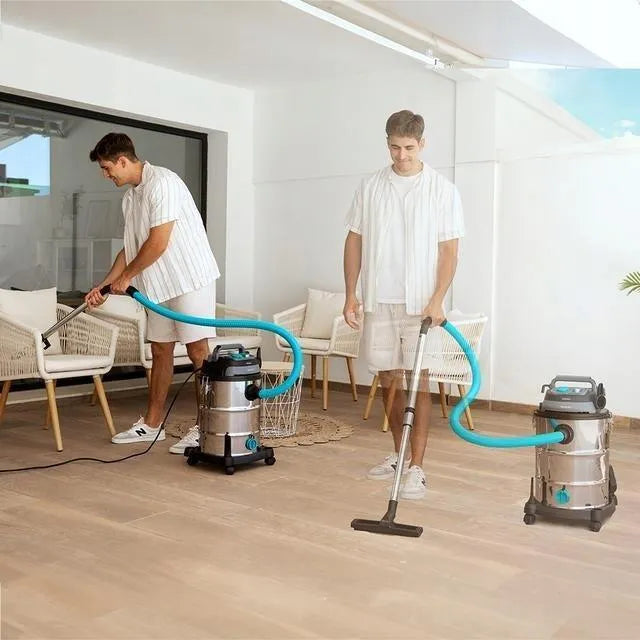 A powerful wet-&-dry canister vacuum (1600 W) with a 30-litre metal tank, built to handle both solid debris and liquids. It includes a blower function, double filtration, and even a tool socket so you can connect electric tools to vacuum up the dust they make. It comes with accessories (floor brush, corner tool, etc.) and is designed to be durable, easy to move (wheels + handle), and to reach far with a hose + cord system.