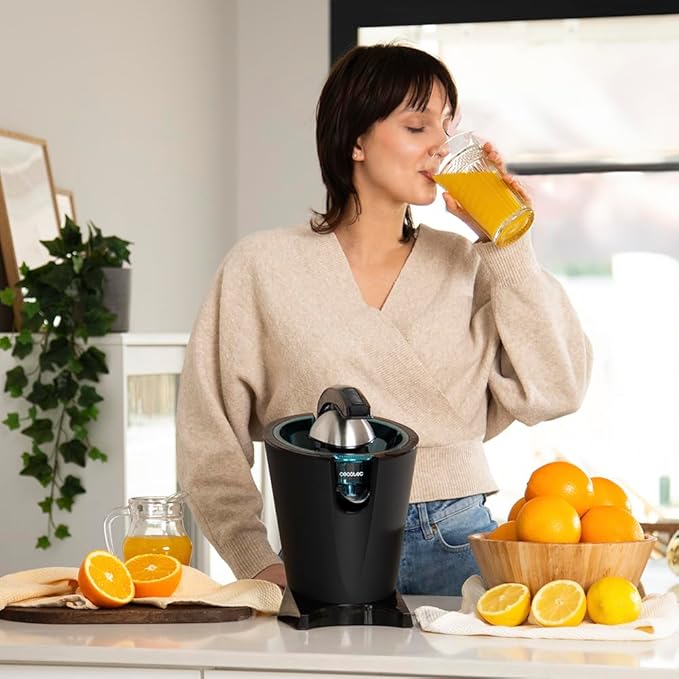 An electric lever-style juicer made for citrus fruits. You press down a lever that pushes the fruit against a cone, so you get juice with less effort. Designed to be fairly fast, easy to use & clean.