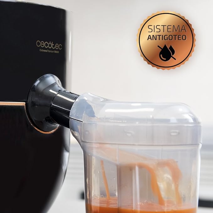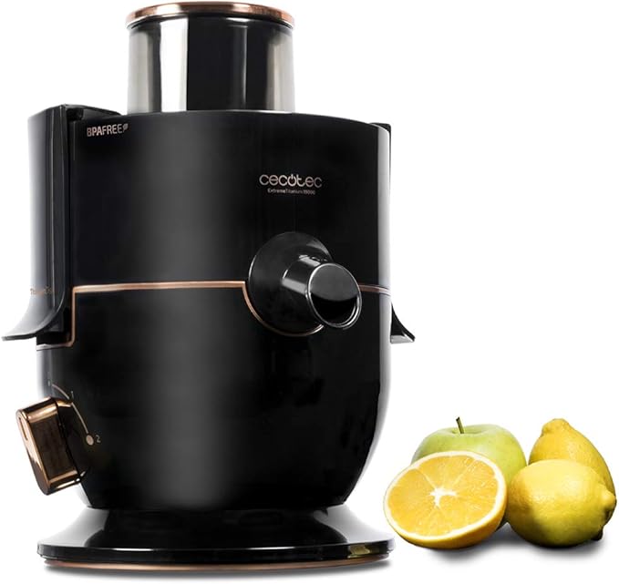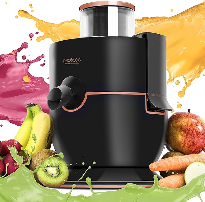 The Cecotec ExtremeTitanium 19000 is a high-speed orbital/centrifugal juicer / blender (depending on model variant). It emphasizes fast extraction, durability (via a titanium-coated disc), and the ability to process whole fruits or large pieces thanks to a wide feed chute.
