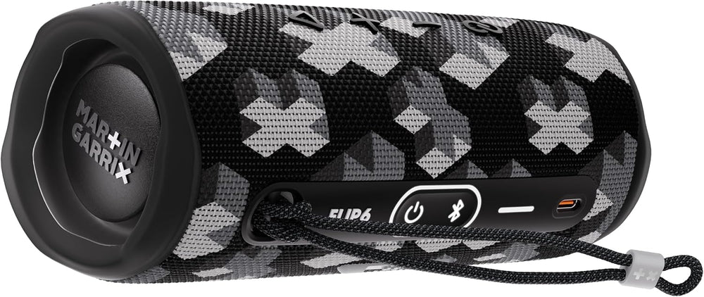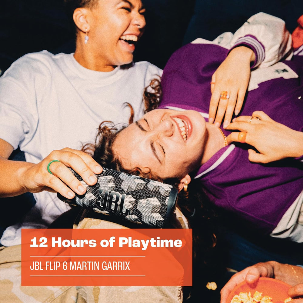 Your adventure. Your soundtrack. The bold JBL Flip 6 delivers powerful JBL Original Pro Sound with exceptional clarity thanks to its 2-way speaker system consisting of an optimized racetrack-shaped driver, separate tweeter, and dual pumping bass radiators. This big-sounding, yet easy to carry speaker is waterproof and dustproof, so you can take it anywhere in any weather. And with 12 hours of battery life, you can party 'til the sun goes down—or comes up—wherever the music moves you. Use PartyBoost to link multiple compatible speakers. The Flip 6 comes in a variety of cool colors.